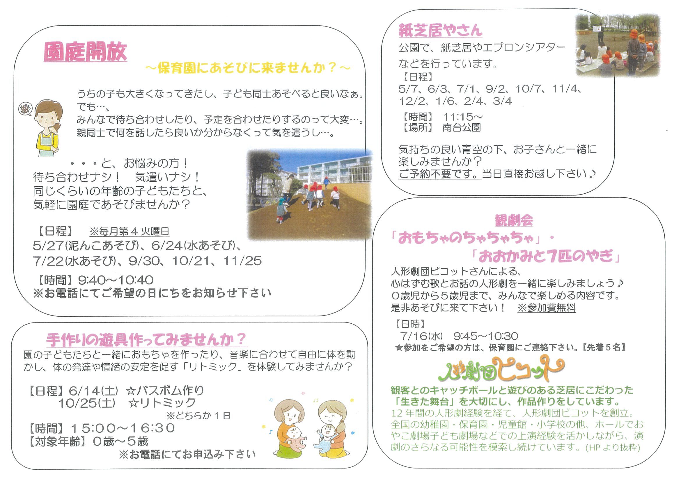 ふじみ保育園では、地域の子育て中のママたち、パパたちに向けて、一年を通して様々な催しを企画中です!