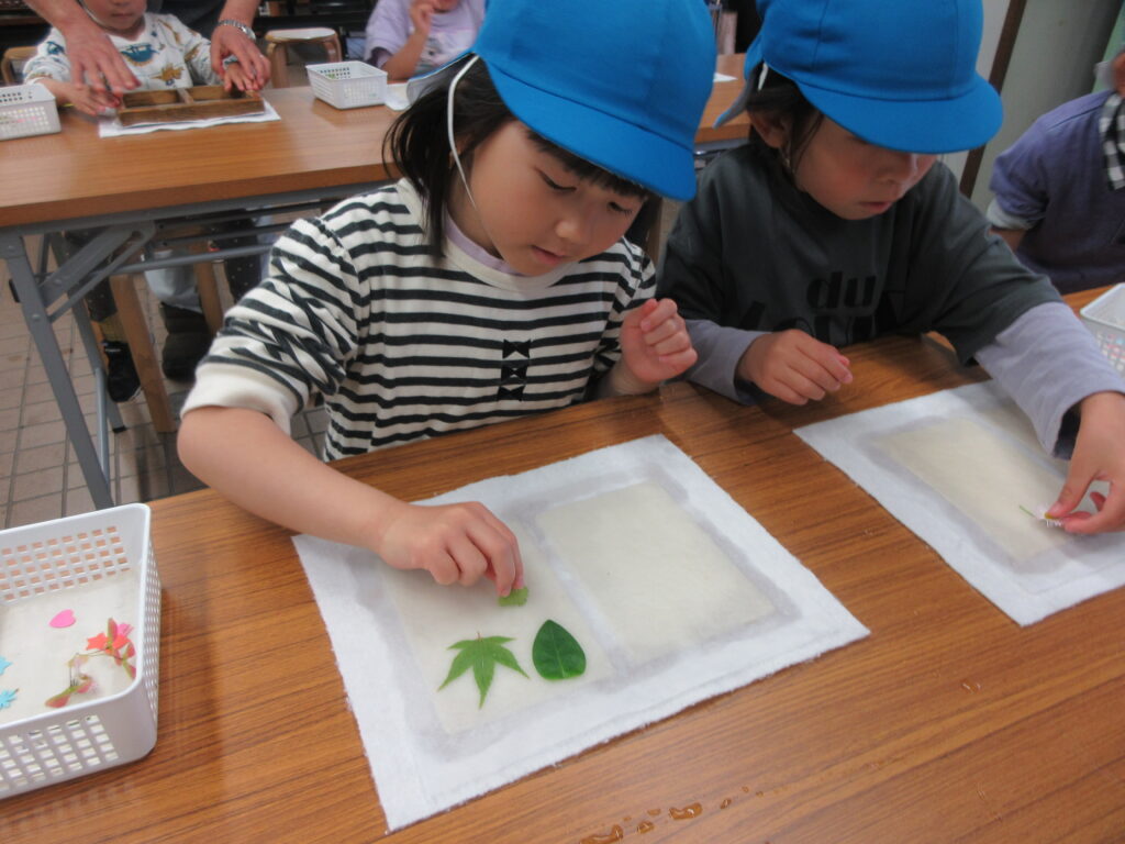 施設の人と一緒に紙を漉き、好きな葉っぱを置いてデコレーションし、オリジナルの紙を作りました。