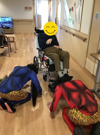 節分 2024-02-27 2月3日(土)、節分の豆まきを行いました。赤鬼と青鬼(スタッフ)へ、入居者の皆様が豆(お手玉)をぶつけて、退治しました。赤鬼と青鬼は土下座をしながら帰っていきましたとさ(笑)