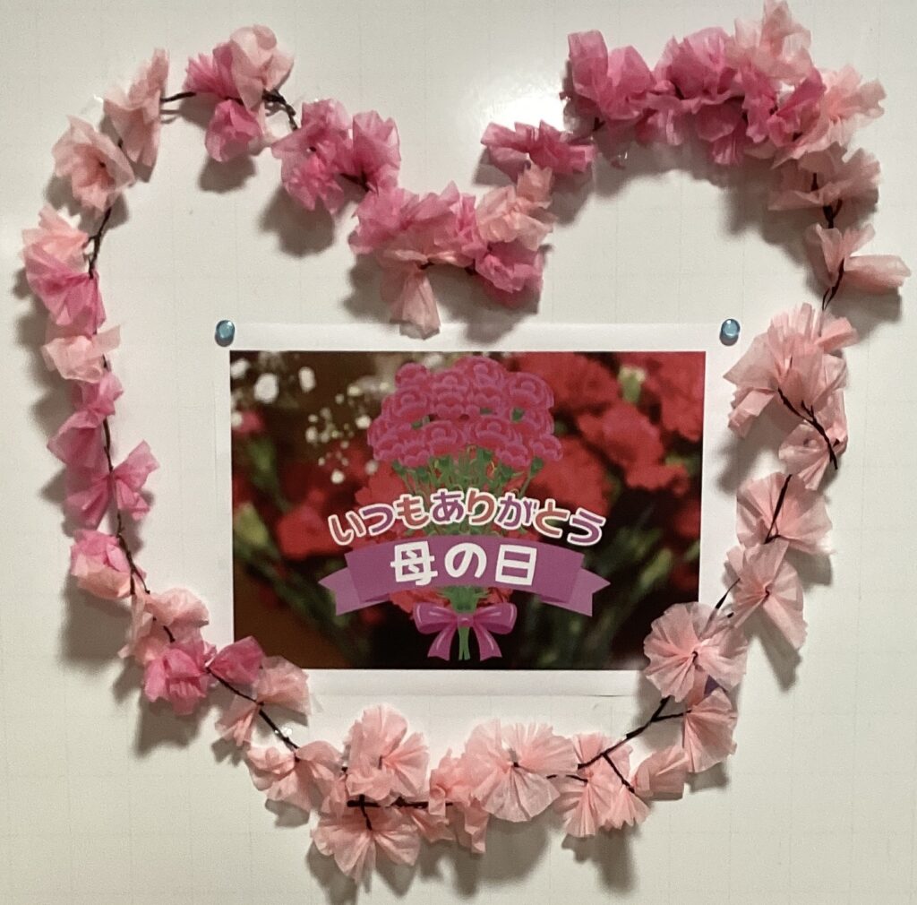 5月11日(日)、各エリアで母の日のお祝いを行いました。カーネーションのイラストやハート型のお花等、華やかな装飾の前で記念写真を撮りました。