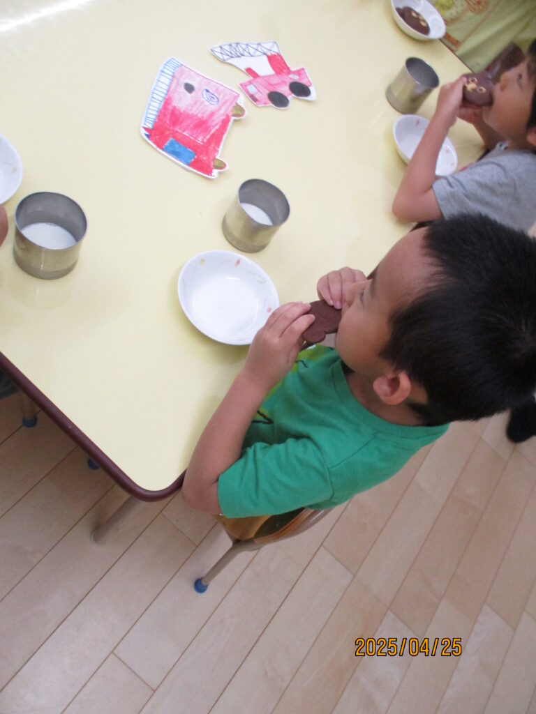 4月生まれの誕生会がありました。年長さんの4月生まれの子どもたちと、栄養士さんと決めたおやつのメニュー”くまさんクッキー”・・・