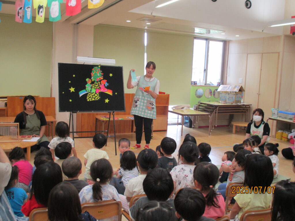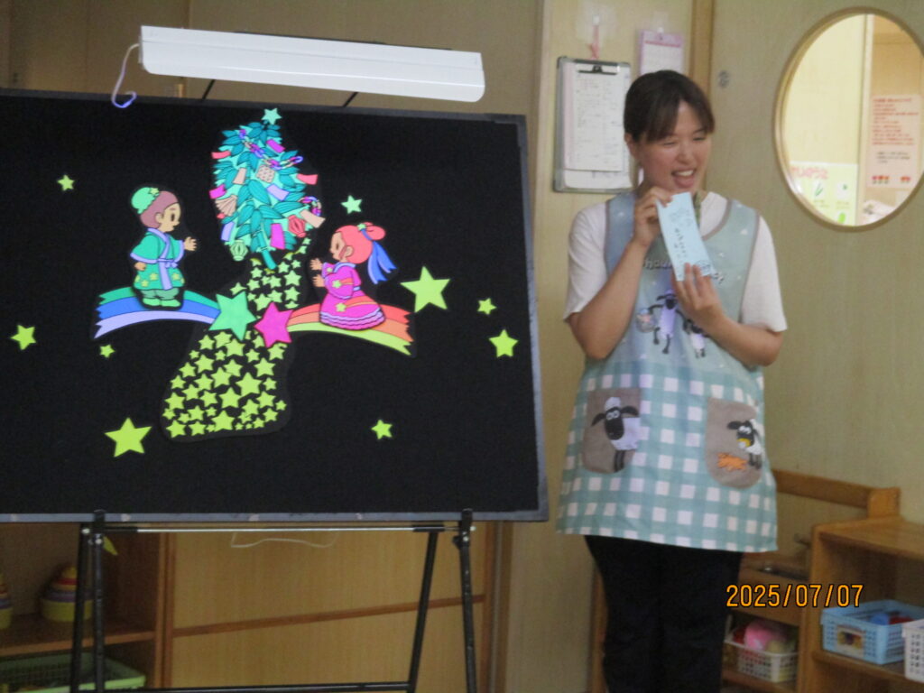 七夕のお話のブラックシアターを見たり、子どもたちの七夕のお願い事の紹介など