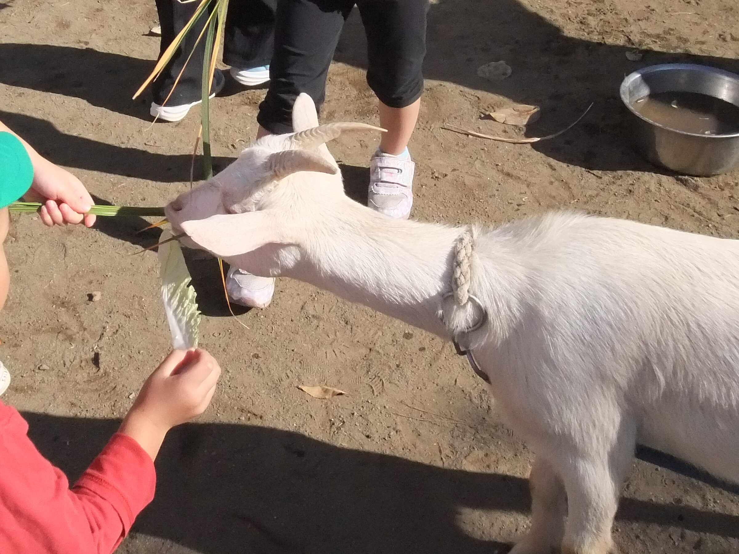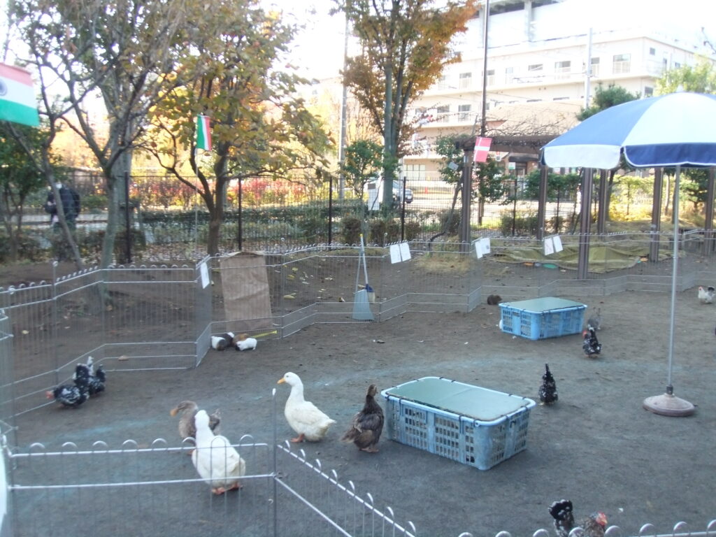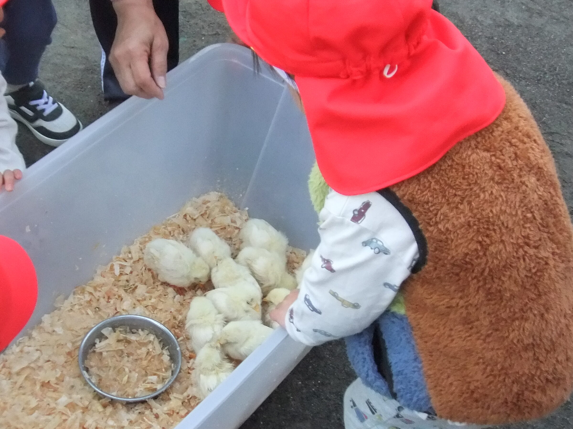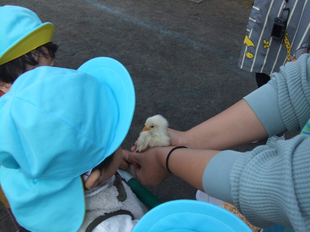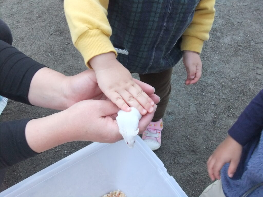 移動動物村 2025-12-04 保育園の園庭に動物さんたちがあそびにきてくれました。 ひよこ、はつかねずみ、モルモット、うさぎ、ちゃぼ、あひる、やぎなど… たくさんの動物たちとふれあうことができました。