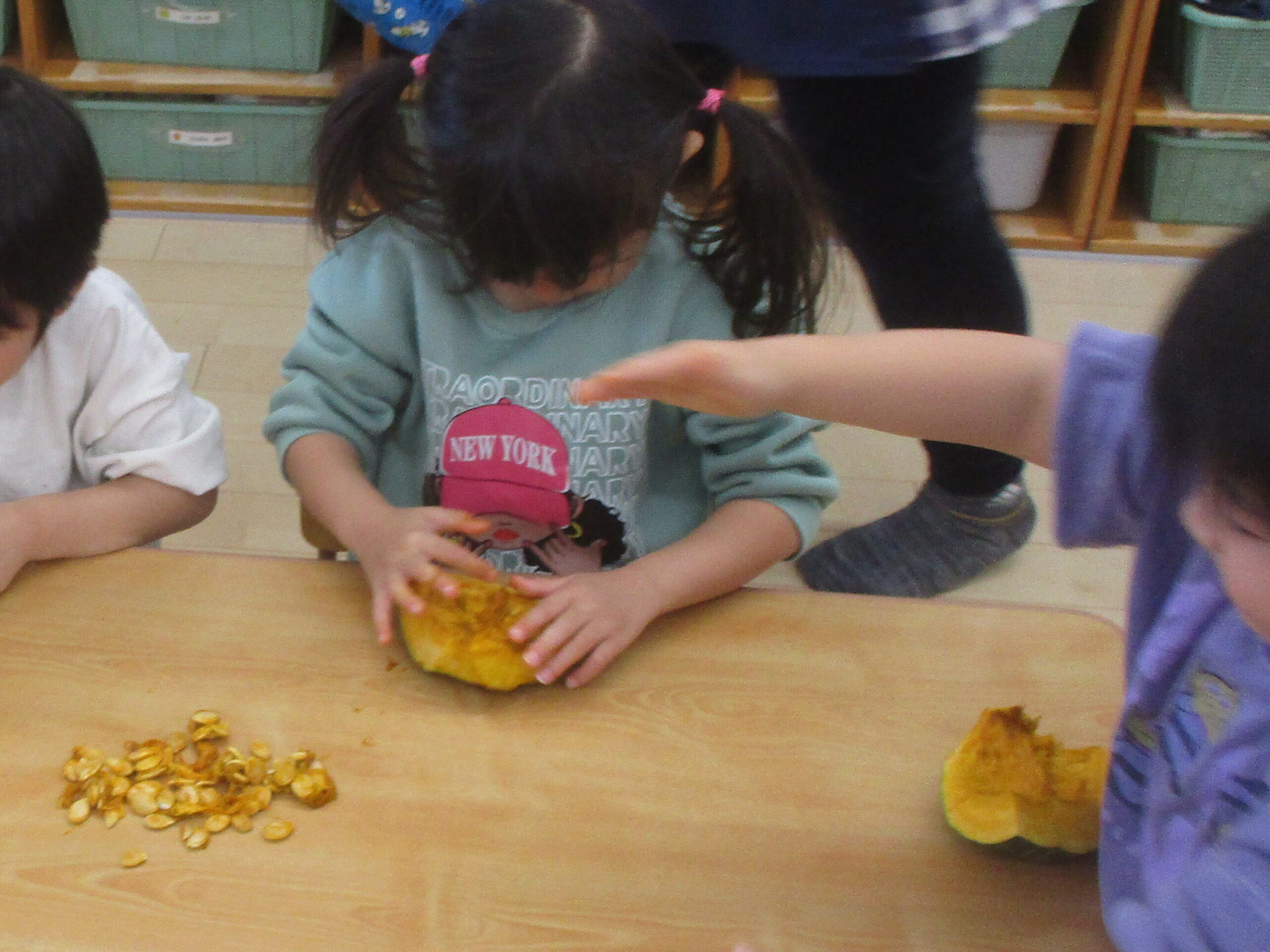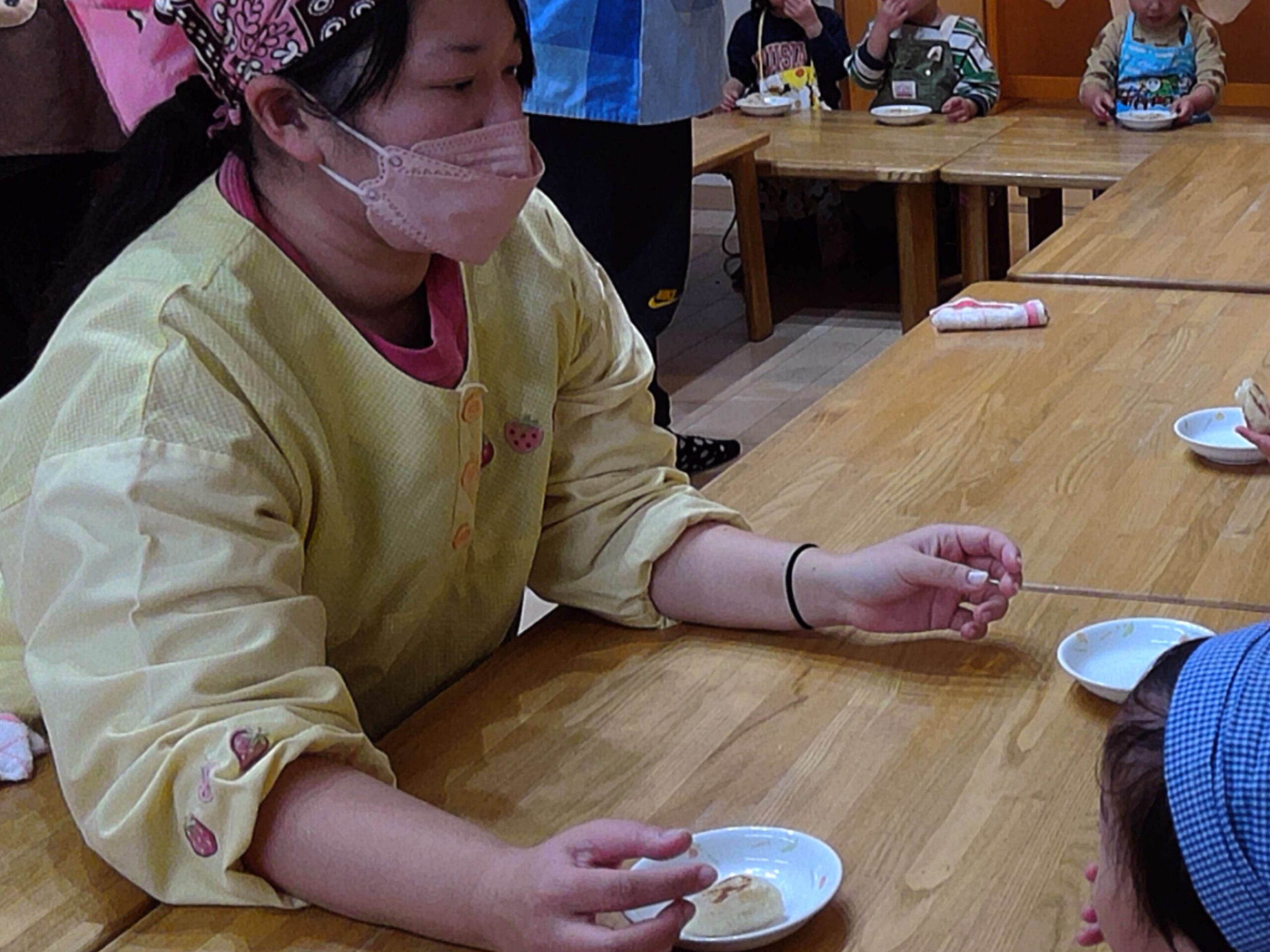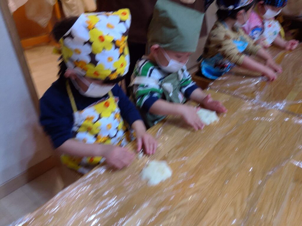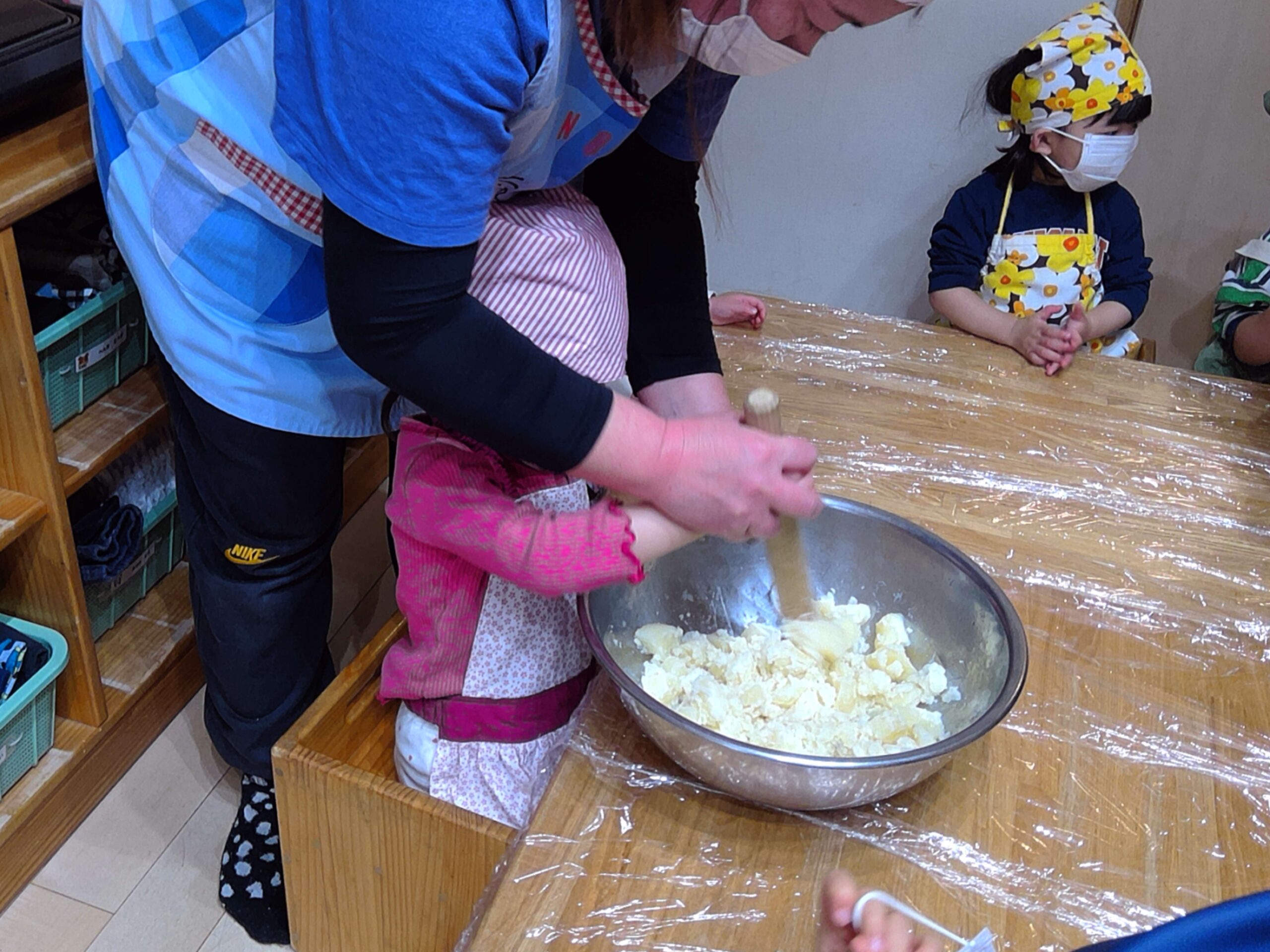 上手においもをつぶしたり、いももちを触ったり、指で確かめたりしながら感触を楽しんでいました。