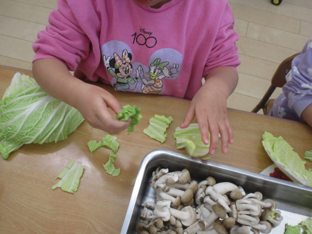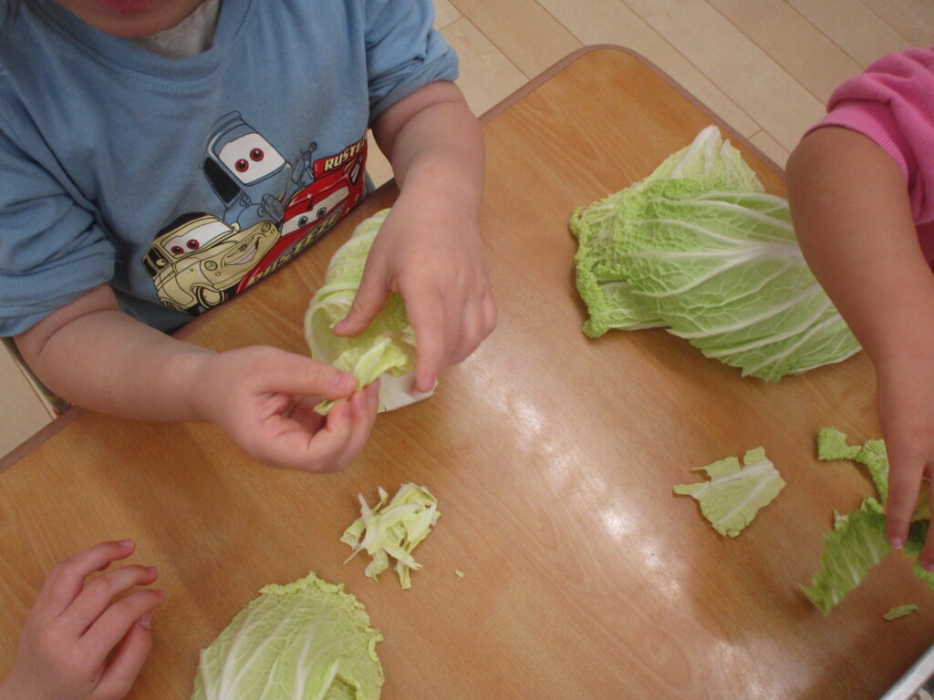 野菜の匂いを確かめたりしながら、上手に細かくちぎることができました。